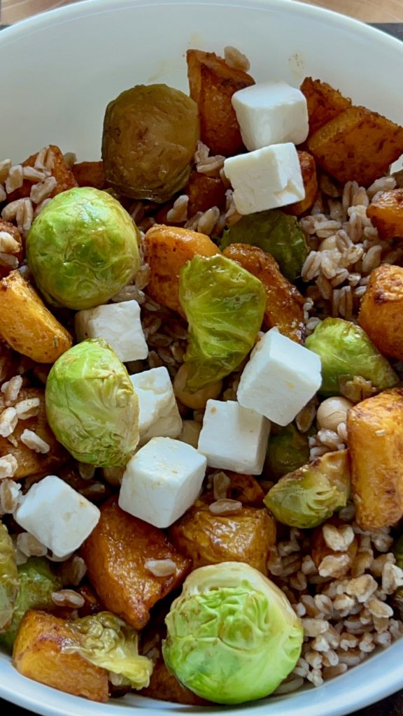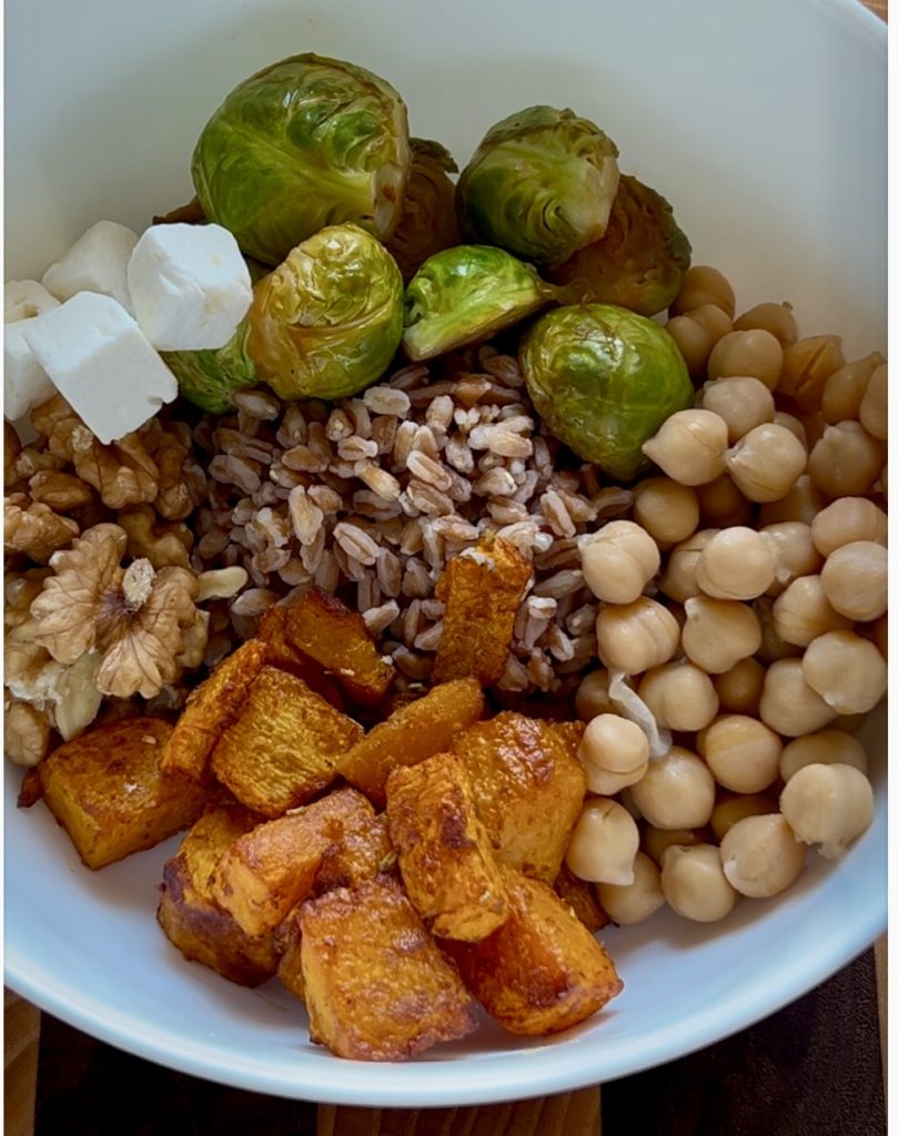 Bowl de farro com legumes, feta e abóbora temperada.