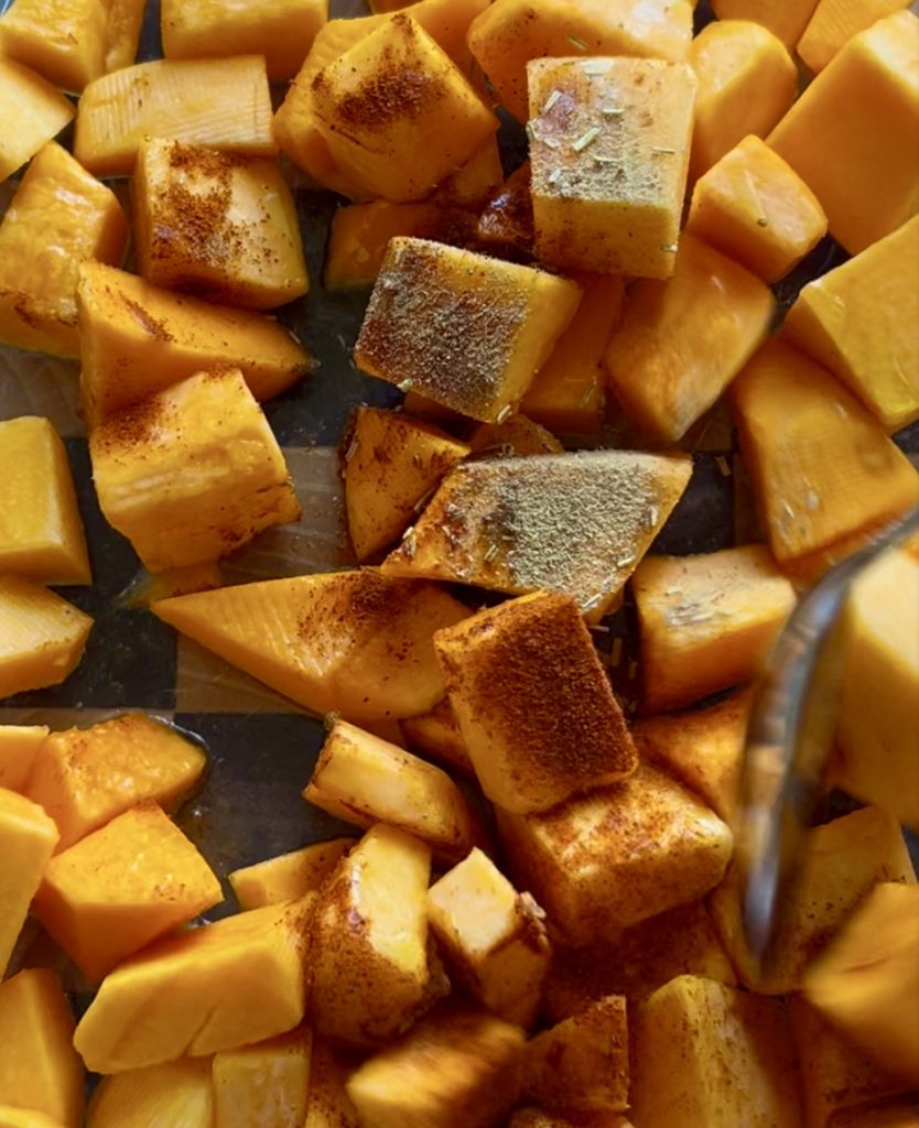 Asse a abóbora no forno a 190°C por 25–30 minutos, temperada com azeite, sal, pimenta e páprica, até ficar macia e levemente dourada.