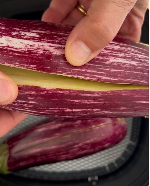 Lave duas berinjelas inteiras, seque-as e faça cortes na superfície com uma faca para facilitar o cozimento. Cozinhe-as inteiras na fritadeira a ar a 180°C por cerca de 45 minutos, velocidade do ar “elevada”, até ficarem macias. Este cozimento é otimizado para minha fritadeira que você encontra nos utensílios.