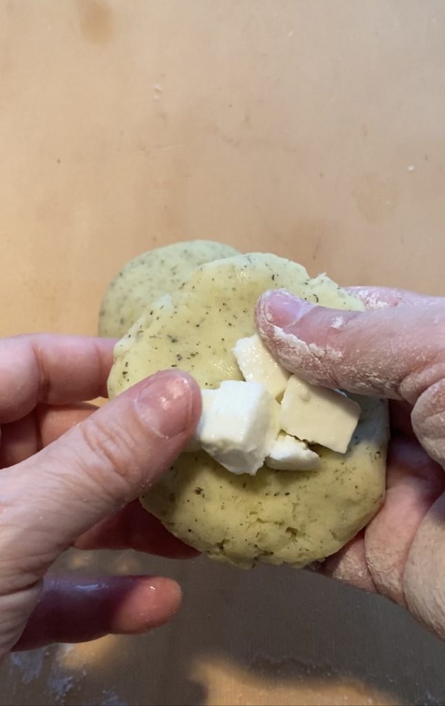 Pegar uma porção da massa, formar um disco, adicionar a muçarela