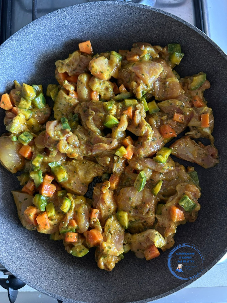 Em uma tigela, coloque o frango cortado em pedaços, adicione o iogurte grego inteiro misturado com a mistura de especiarias, mexa tudo muito bem, cubra com filme plástico e deixe marinar na geladeira por pelo menos uma hora (também é possível deixar a noite toda). Ao composto, se desejar, você pode adicionar também uma cenoura e uma abobrinha cortadas em pedacinhos.
