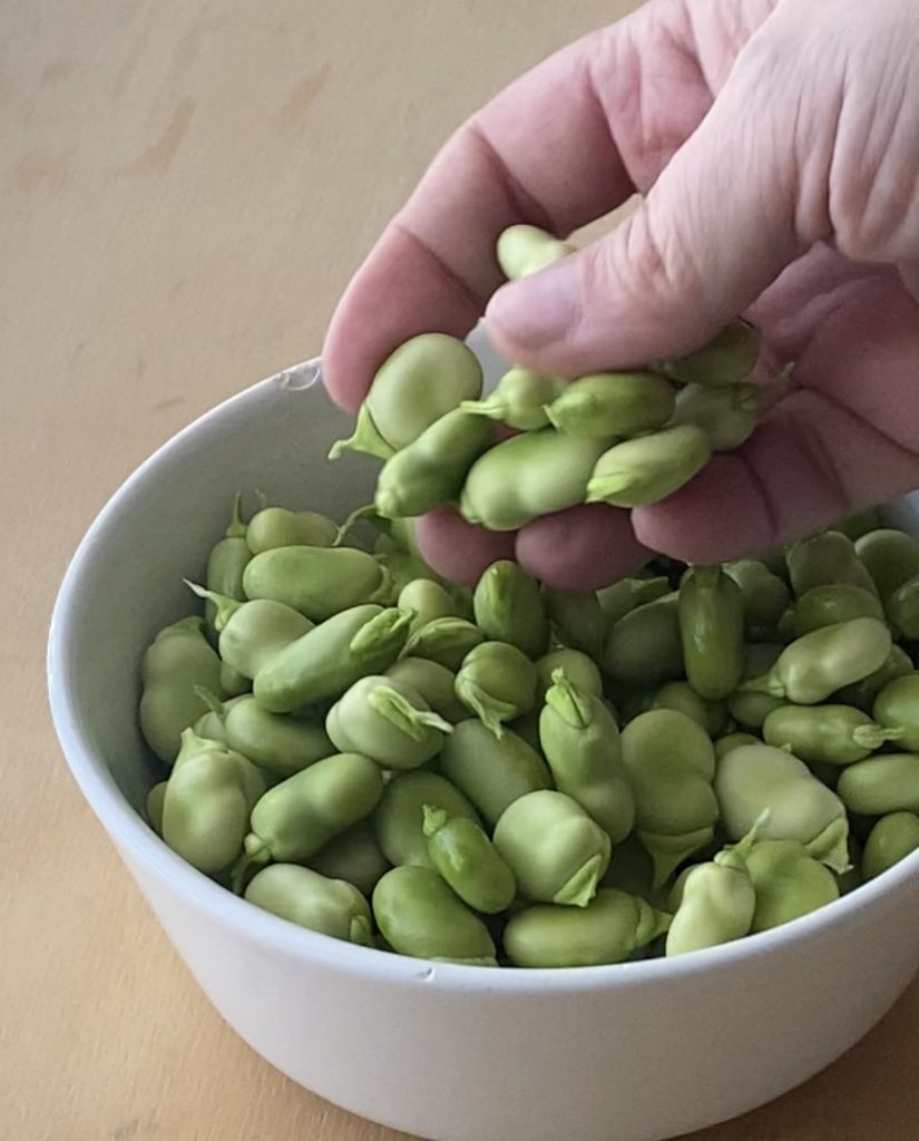 Primeiro, descasque as favas.
