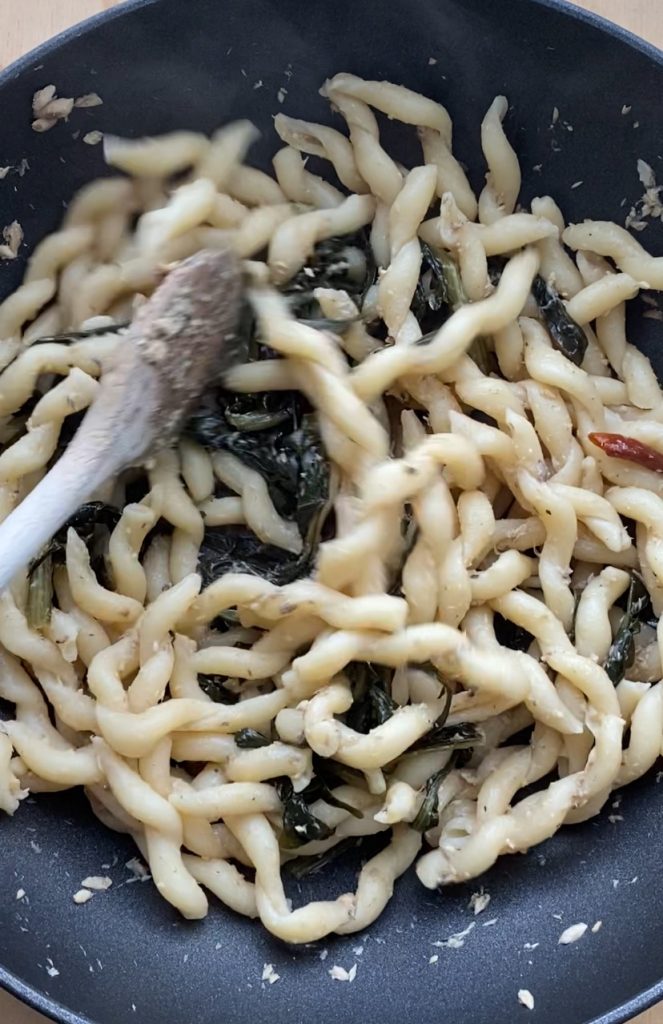 Macarrão anti-desperdício com as sobras de chicória de catalonha, um macarrão criado para evitar jogar fora as folhas mais duras (chicória) da chicória de catalonha.