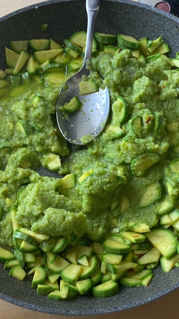 • Refogue a cebola em uma frigideira, adicione a abobrinha e cozinhe por alguns minutos, transfira para um mixer.
