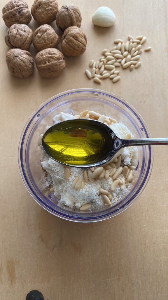 Massa com molho de nozes à genovesa, acredito que seja uma das receitas mais fáceis de preparar porque basta bater todos os ingredientes enquanto a massa cozinha.