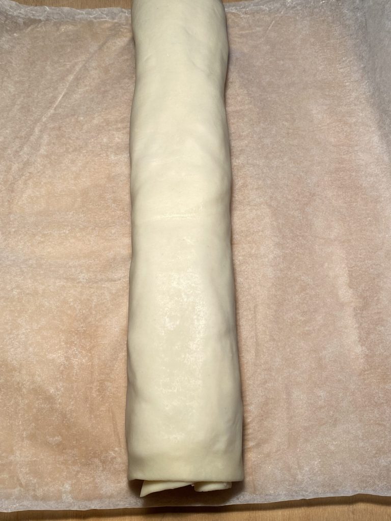 • Após 40 minutos, abrimos a massa, distribuímos dentro as duas colheres de abobrinha ralada e, se desejar, duas colheres de parmesão (ou pecorino), enrolamos e formamos um rolo.