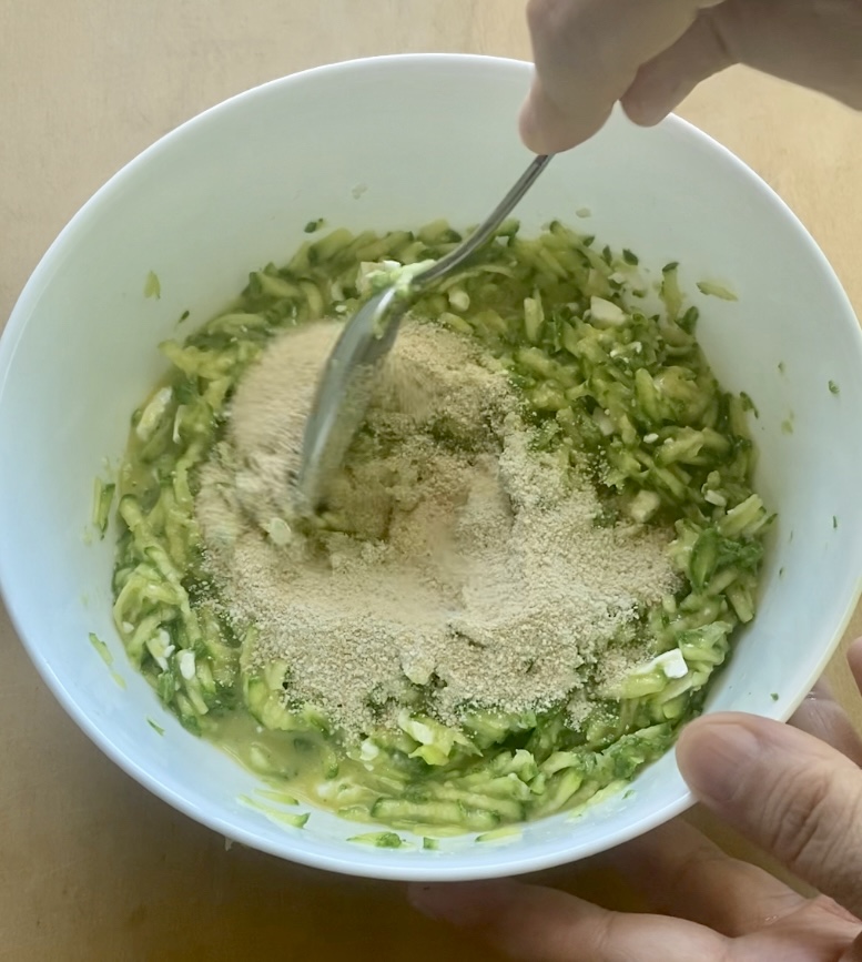O trabalho mais demorado para preparar este prato é ralar, em uma tigela, seis abobrinhas de tamanho médio. Eu geralmente uso aquelas claras que nunca são muito grandes e depois espremê-las bem.