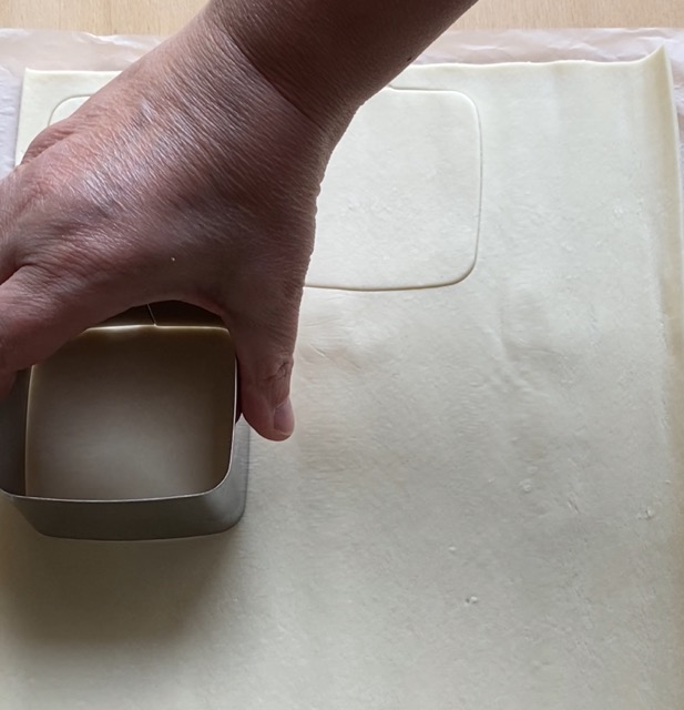 • Com a ajuda de um cortador quadrado, recorte a massa folhada.