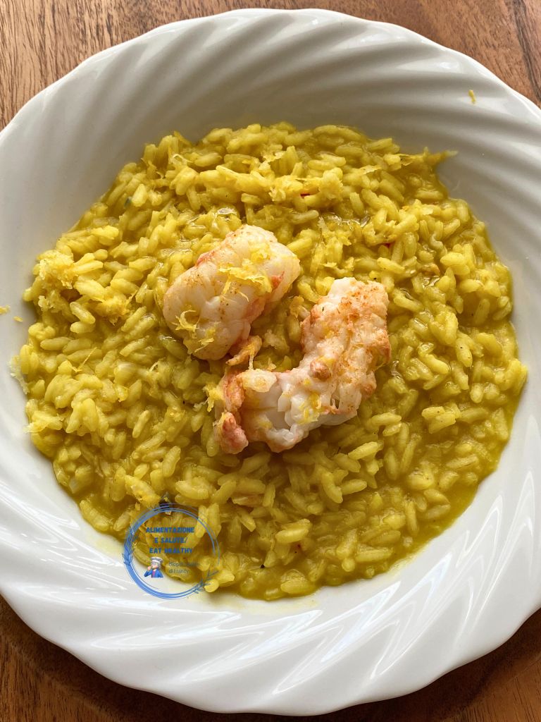 Finalmente minha filha voltou para casa e aqui está o prato favorito dela: risoto de açafrão e camarões, receita saudável.