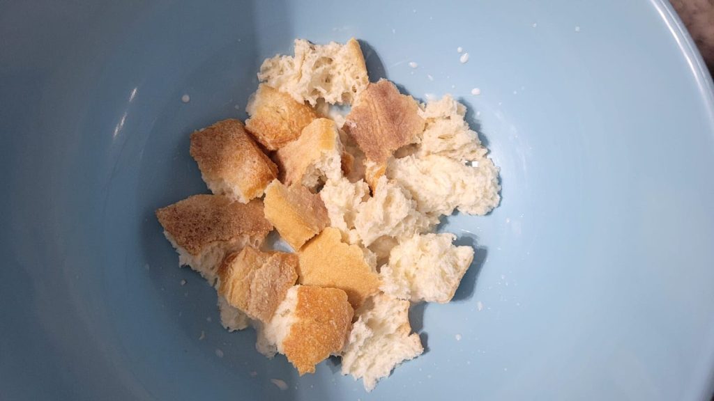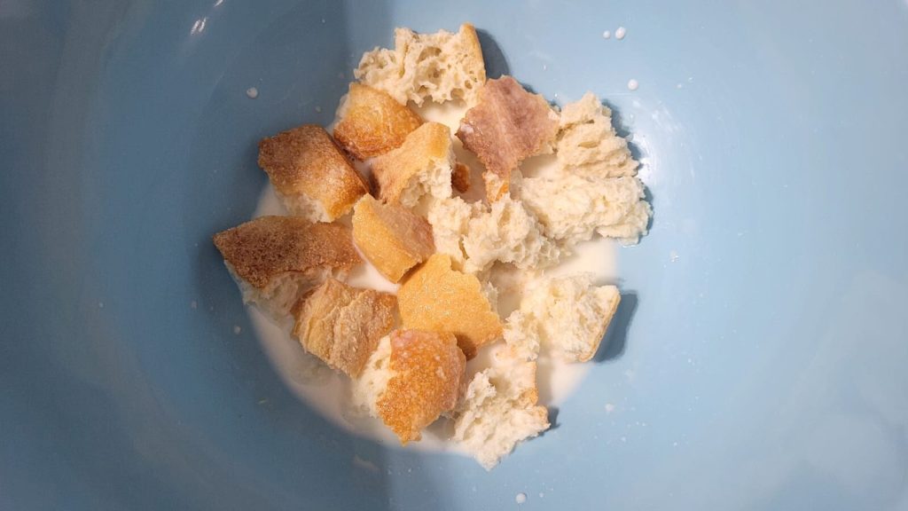 Comece cortando o pão dormido em pedaços e junte-o em uma tigela junto com o leite. Deixe descansar por dez minutos