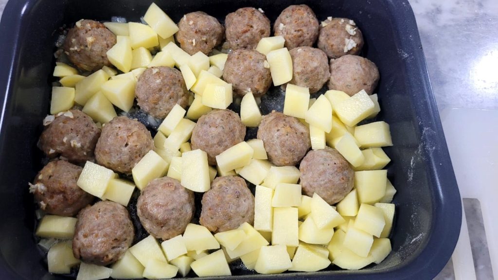 Enquanto as almôndegas e a cebola cozinham, passe para as batatas: lave-as, descasque-as e corte-as em pedaços não muito grandes