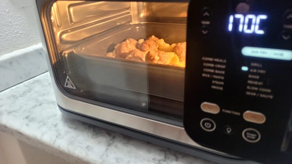 Terminados os primeiros 10 minutos de cozimento, adicione o açafrão dissolvido às almôndegas com as batatas, coloque a forma de volta na fritadeira e cozinhe novamente a 170º por mais 10 minutos, mexendo sempre algumas vezes e finalizando o cozimento aumentando a temperatura para 200º por 10 minutos.