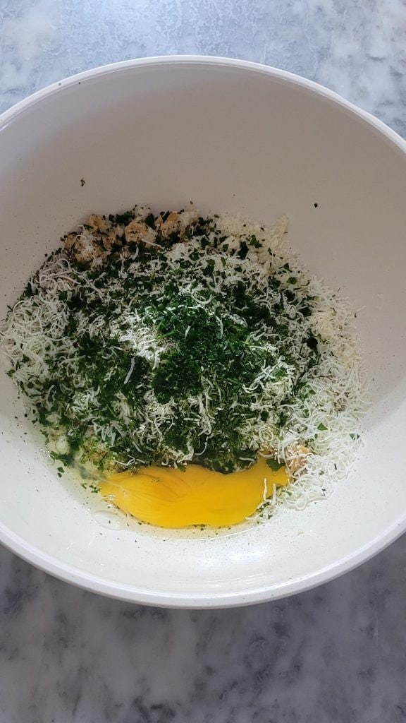 Em outra tigela, coloque o grana, o pecorino, a salsinha, a cebolinha, uma pitada de sal e pimenta a gosto. Escorra bem o pão da água e adicione ao resto dos ingredientes