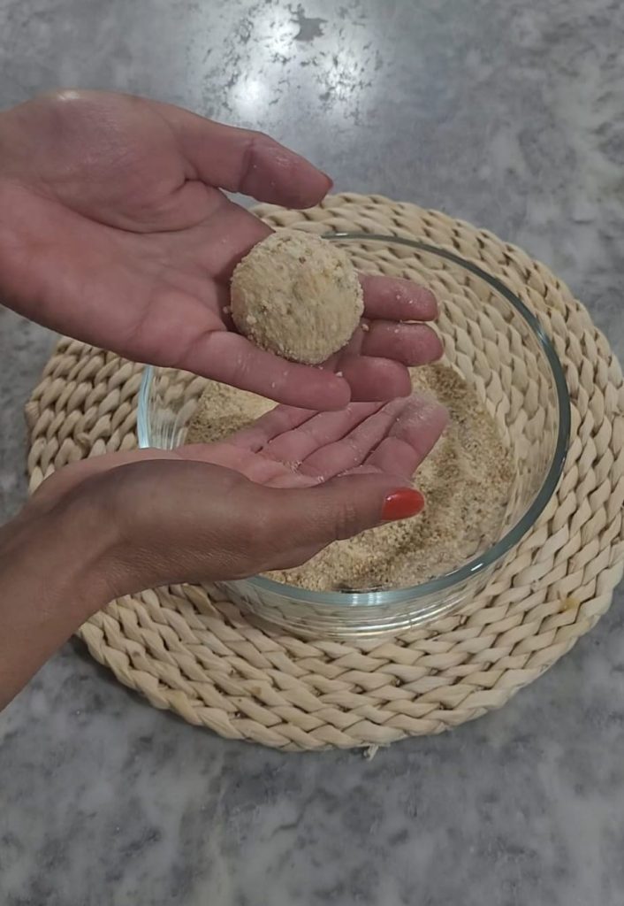 Passe-as na farinha de rosca, pressionando bem para aderir