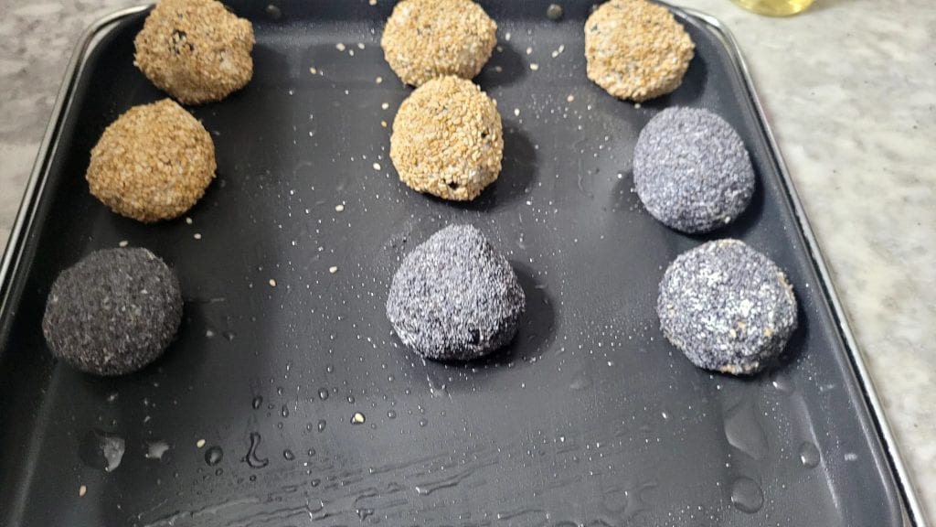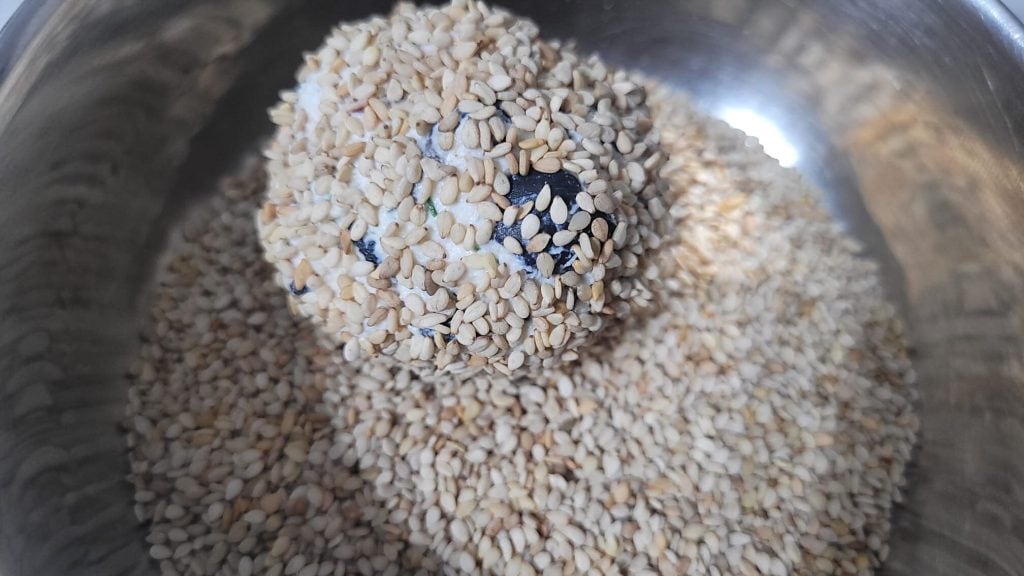 Com as mãos ligeiramente úmidas, forme as almôndegas, pegando um pouco da mistura. Role-as nas tigelinhas que você preparou anteriormente com os dois tipos de sementes. Estas são com sementes de gergelim