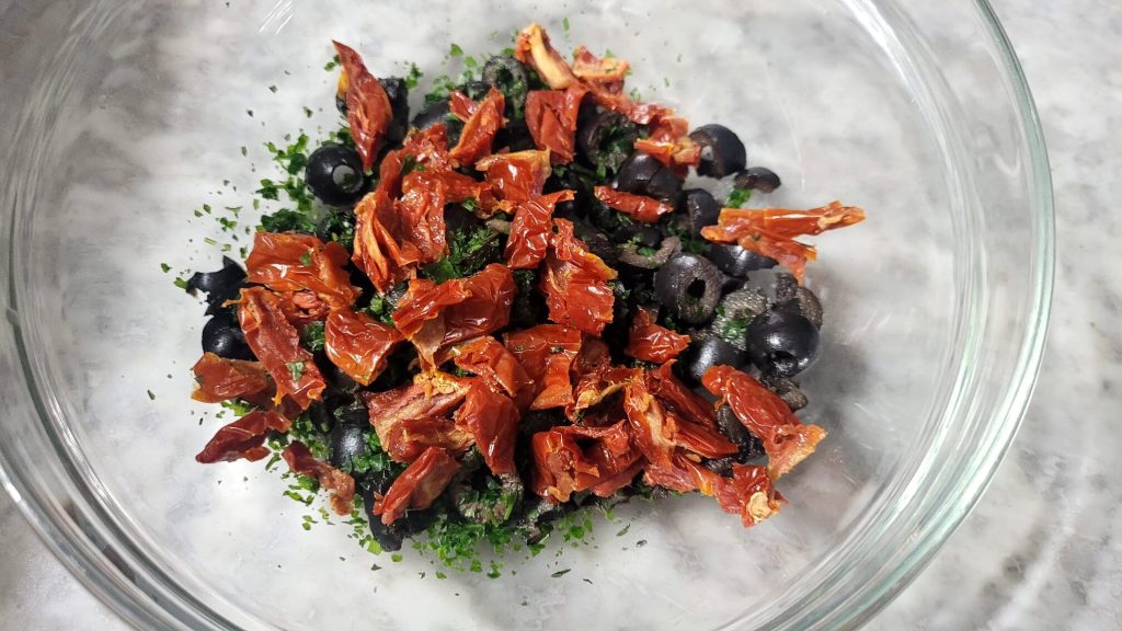 Comece picando a salsa, cortando as azeitonas em rodelas e os tomates secos em pedaços. Coloque tudo em uma tigela