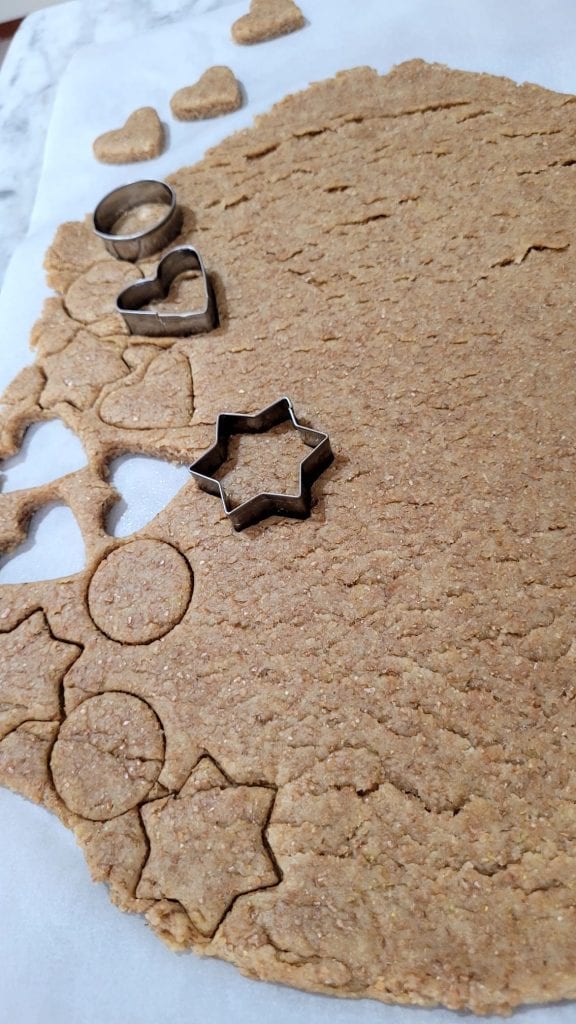 Dê forma aos biscoitinhos com cortadores de biscoito, eu usei pequenas forminhas em forma de coração, círculo e estrela