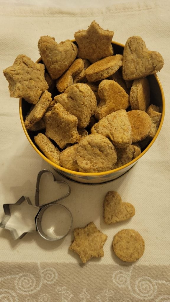 Hoje trago para vocês uma receitinha fácil para oferecer como prêmio aos nossos fiéis amigos de 4 patas🐶: Biscoitinhos para cães feitos em casa, cozidos na Fritadeira sem óleo. Já aconteceu de você ficar sem prêmio para seus peludinhos? Comigo sim… então decidi fazê-los em casa😍 Fiz uma pesquisa na web e a receita que mais me inspirou foi a de Benedetta Rossi, modificando-a levemente, também com base no que eu tinha disponível em casa. Uma receita fácil, com uma massa sem descanso, onde os ingredientes são misturados todos juntos em uma tigela e que são cozidos logo após serem cortados com as forminhas.