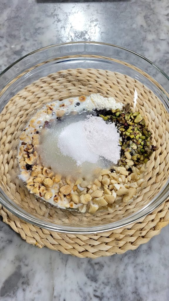 Pique grosseiramente as frutas secas e coloque-as em uma tigela com o restante dos ingredientes