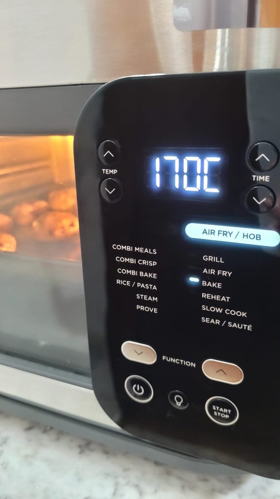 Pré-aqueça a fritadeira por 2/3 minutos a 170º no programa bake ou air fry. Coloque os biscoitos na bandeja ou na grelha do cesto da sua fritadeira a ar e pressione-os levemente com as mãos
