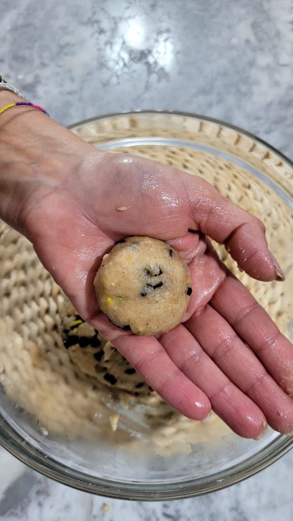 Retire pedaços de massa e forme bolinhas do tamanho de uma noz