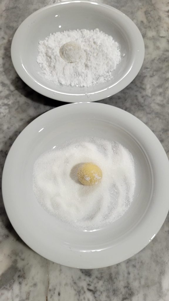 Coloque um pouco de açúcar refinado e açúcar de confeiteiro em duas tigelinhas separadas. Pegue porções de massa do tamanho de uma noz. Role cada bolinha primeiro no açúcar refinado, depois no açúcar de confeiteiro para obter o efeito craquelado ao assar.