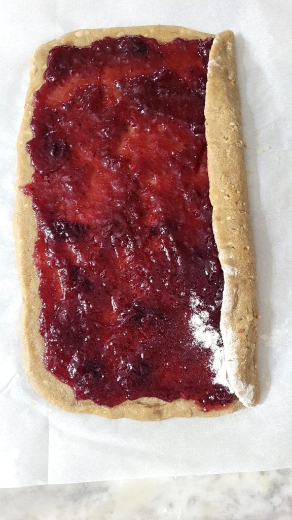 Após o descanso, divida a massa em duas partes e abra-as com um rolo a uma espessura de cerca de meio centímetro, entre dois pedaços de papel manteiga levemente enfarinhados, formando 2 retângulos. Distribua a geleia de frutas vermelhas ou o sabor que você escolheu, deixando um pouco de borda em todos os 4 lados