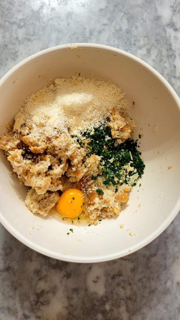 Após o tempo de descanso, esprema bem o pão e adicione todos os ingredientes, exceto a farinha de rosca, misturando bem. Adicionei 2 colheres de farinha de rosca depois porque a mistura estava muito macia; se a sua mistura já estiver compacta, não é necessário adicionar, ou adicione aos poucos até atingir a consistência desejada.