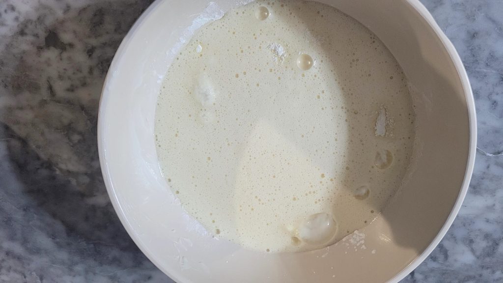 Antes de começar, lembre-se de usar o iogurte e os ovos em temperatura ambiente. Despeje o iogurte em uma tigela pequena e reserve, lave e seque o pote. Em outra tigela grande, despeje os 2 potes de açúcar, adicione os ovos e bata com a batedeira até obter um composto claro e espumoso