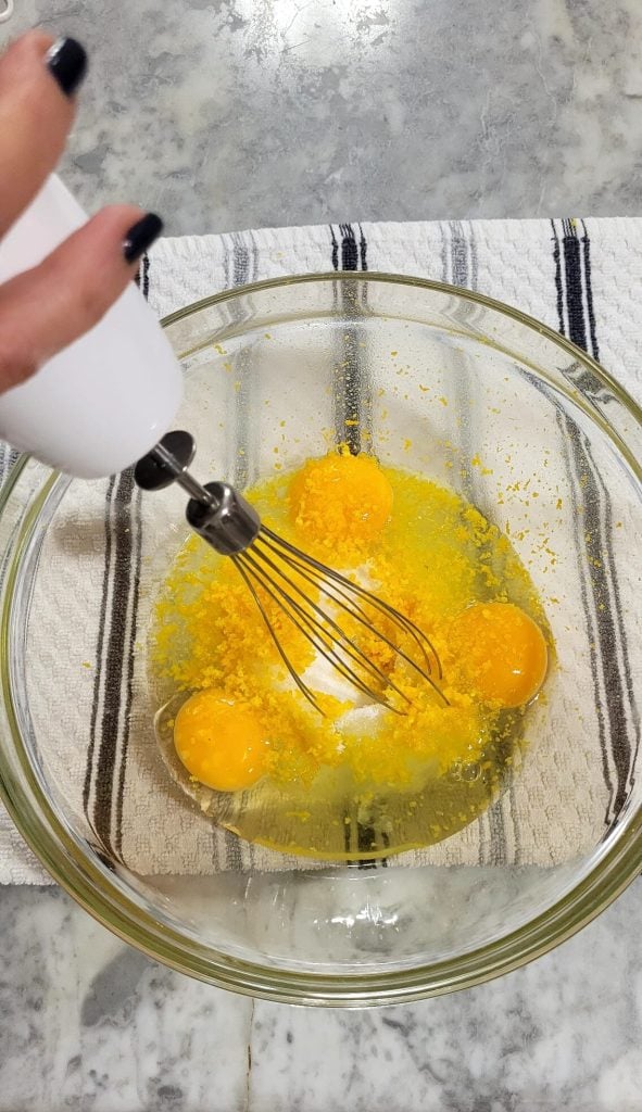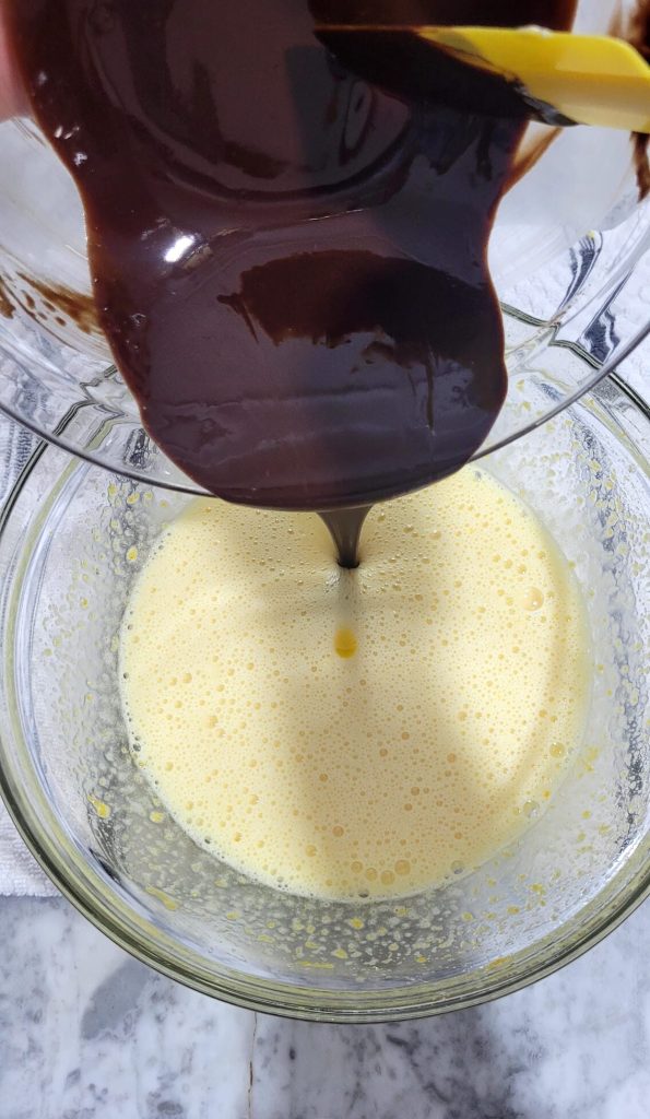Enquanto o chocolate esfria, bata os ovos com o açúcar, a casca de laranja ralada e uma pitada de sal. Você deve obter uma mistura clara e espumosa