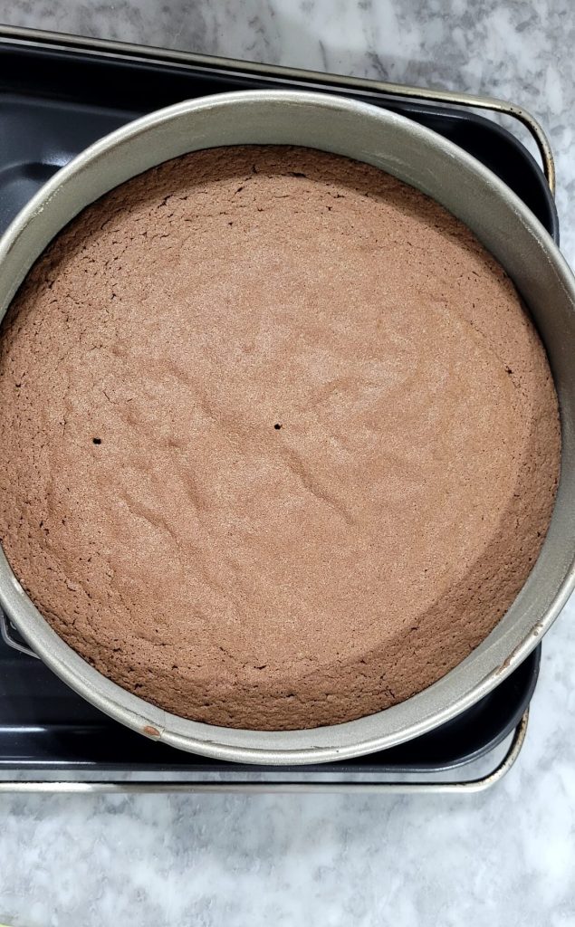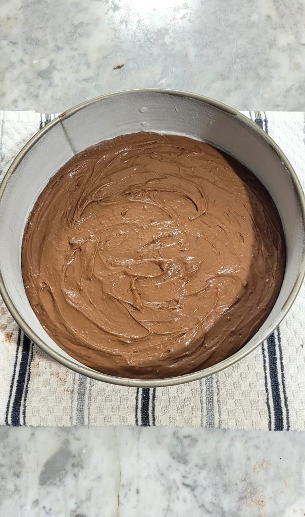 Despeje a mistura em uma forma de fundo removível de 22/24cm (eu usei de 24 cm) untada e enfarinhada. Nivele a superfície e pré-aqueça a frigideira a 160º por 2/3 minutos no programa bake ou air fry