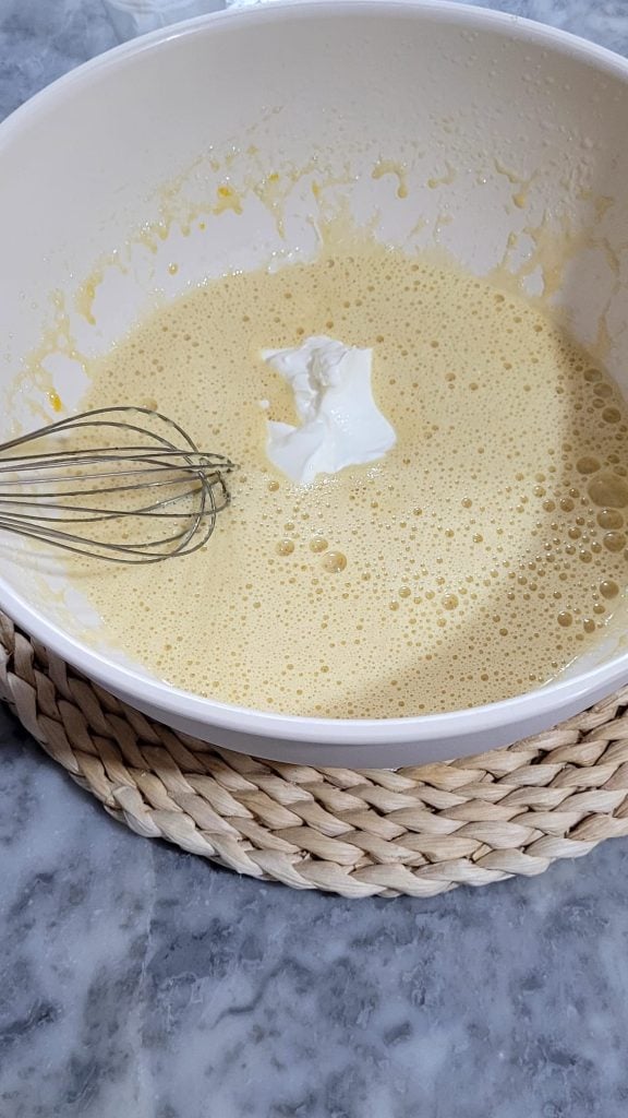 • Agora, adicione a farinha e o fermento peneirados de uma só vez e misture até que a mistura esteja lisa e homogênea