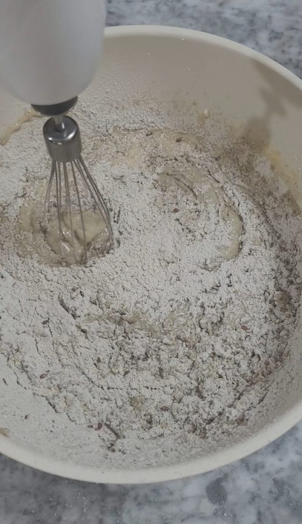 Adicione agora a farinha. Se utilizar a farinha multicereal com sementes, não precisa peneirar, mas se utilizar farinha 00 peneire antes de adicionar à massa. Junto com a farinha, adicione o pacote de fermento peneirado. Reserve