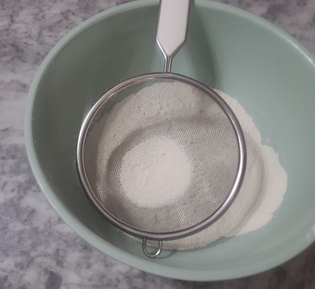 Em outra tigela, peneire a farinha e o fermento e adicione uma pitada de sal