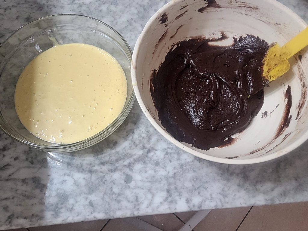 Pegue outra tigela e divida a massa obtida, e adicione o cacau peneirado em uma das duas tigelas. Misture bem com uma espátula