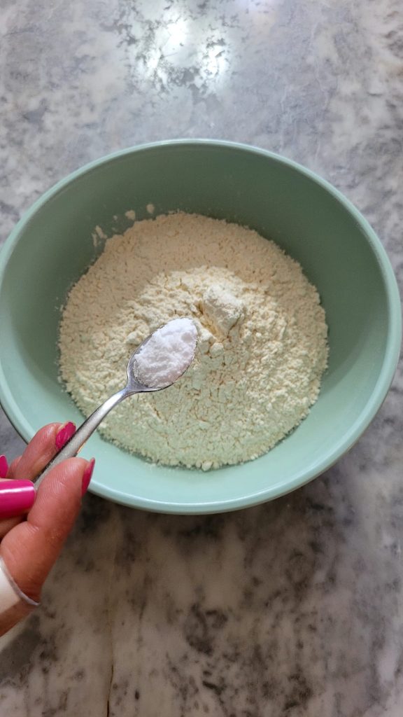 Em uma tigela, coloque a farinha e adicione uma colher de chá de bicarbonato