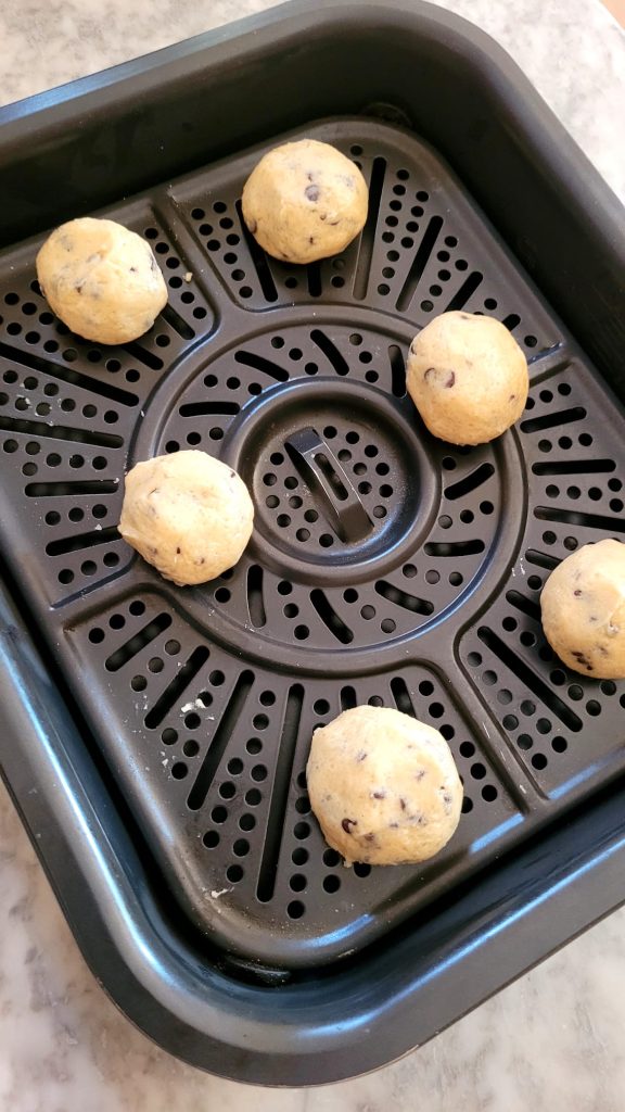 Cozinhei os Cookies obviamente, como vocês já sabem, na Airfryer, mas como sempre digo, podem ser assados tranquilamente no forno. Considerando a típica forma redonda e larga dos biscoitos, entendo que usar a frigideira, se não for particularmente grande, pode levar a muitas mais fornadas. Eu também tive que fazer isso, apesar de a minha ser bastante espaçosa, porque a forma de bolinhas que daremos à massa irá se achatar durante o cozimento, espalhando-se na bandeja, por isso devem ser posicionadas bem espaçadas umas das outras. Tendo uma frigideira tipo forno, alternei bandeja e grelha air fry para acelerar um pouco o processo. Enquanto assava as primeiras, mantive as outras na geladeira, para que não amolecessem muito enquanto aguardavam para serem assadas.