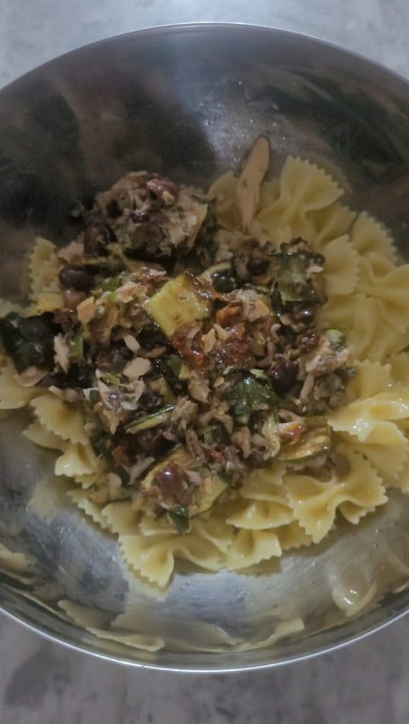 Estas Farfalle frias com atum e abobrinhas grelhadas na Fritadeira a ar são maravilhosas! O verão chegou e o calor nos leva a consumir refeições frescas, tentando usar o mínimo possível o forno e os fogões. Mas… temos que comer e variar ao máximo a alimentação, especialmente, como aconselham os especialistas, frutas e verduras. Nem todas as verduras, porém, podem ser consumidas cruas, ou, de qualquer forma, preferimos cozidas… é aí que entra em cena a Fritadeira a ar que emite menos calor que um forno, que aliás também precisa ser pré-aquecido, com cozimentos mais rápidos e ágeis, e por isso, hoje proponho este prato principal muito saboroso e fresco: Farfalle com atum e abobrinhas grelhadas na Fritadeira a ar.