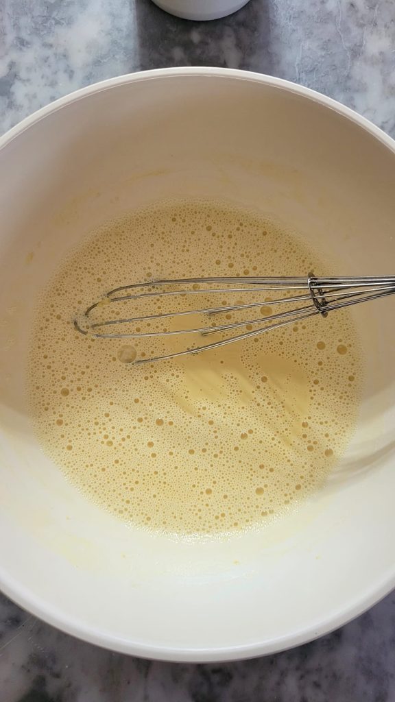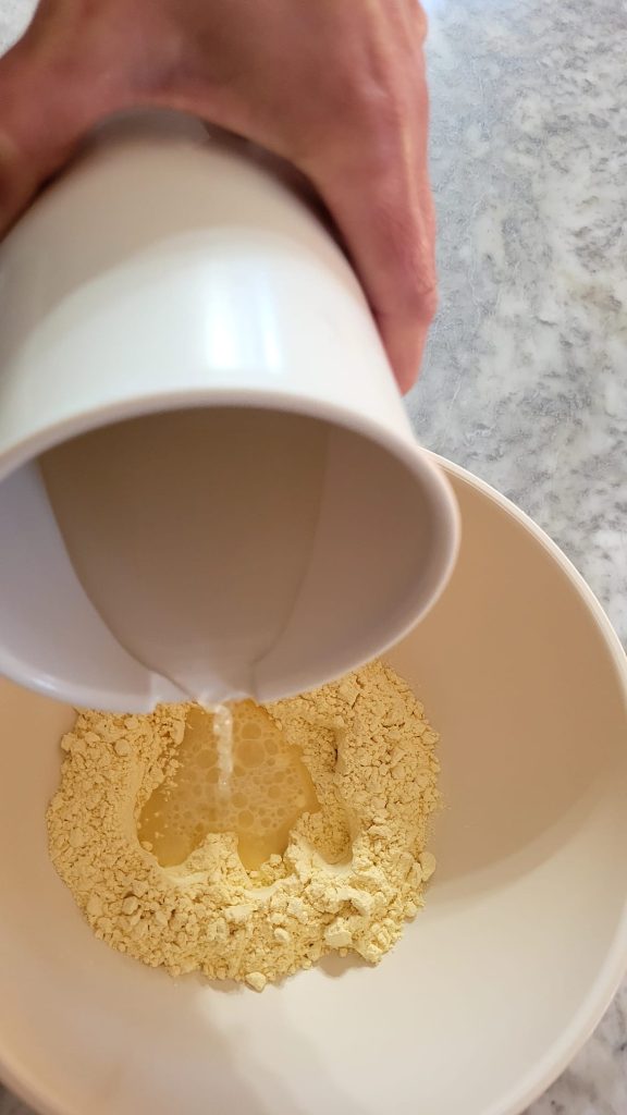 • Despeje a farinha de grão-de-bico em uma tigela. Faça um buraco no centro e adicione a água aos poucos mexendo com o batedor até terminar toda a água