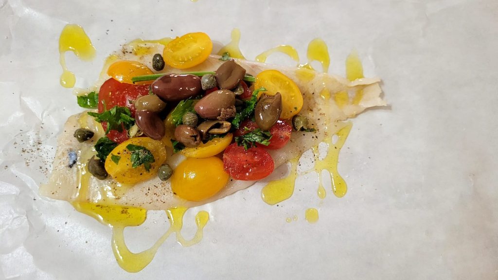 • Seque bem, com papel absorvente os filés de linguado e coloque-os em uma folha de papel manteiga, se quiser, pode colocar dois filés para cada papillote, eu adoro porções individuais e decidi preparar um papillote para não ter que dividir as porções. Adicione todos os ingredientes que você decidiu usar, neste caso tomates cereja cortados ao meio, azeitonas, alcaparras previamente dessalgadas, salsinha picada grosseiramente, incluindo alguns talos, azeite de oliva, sal e pimenta