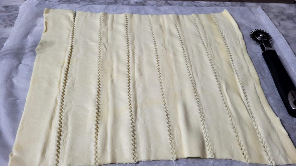 Agora desenrole a massa folhada e corte-a, com o cortador, em 8 tiras de largura mais ou menos igual. Se não tiver o cortador ondulado, o liso também serve
