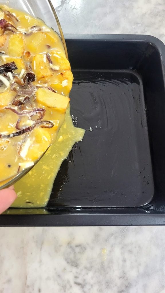 Unte a assadeira que você decidiu usar para cozinhar a frittata, com um pouco de óleo. Despeje a mistura e nivele bem