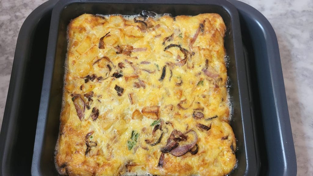 Corte e sirva a Frittata de Batatas e Cebolas de Tropea na Airfryer quente ou morna 😋😋