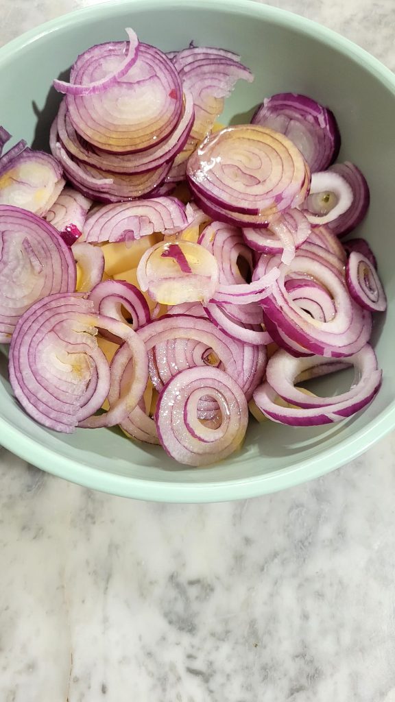 Rale a ricota salgada ou o queijo que escolheu usar, pique as folhas de hortelã, eu usei 6, misture e adicione as batatas e cebolas. Misture tudo
