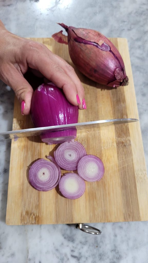 Passe para as cebolas: retire as duas extremidades e a casca, corte-as não muito finas para evitar que queimem durante o cozimento