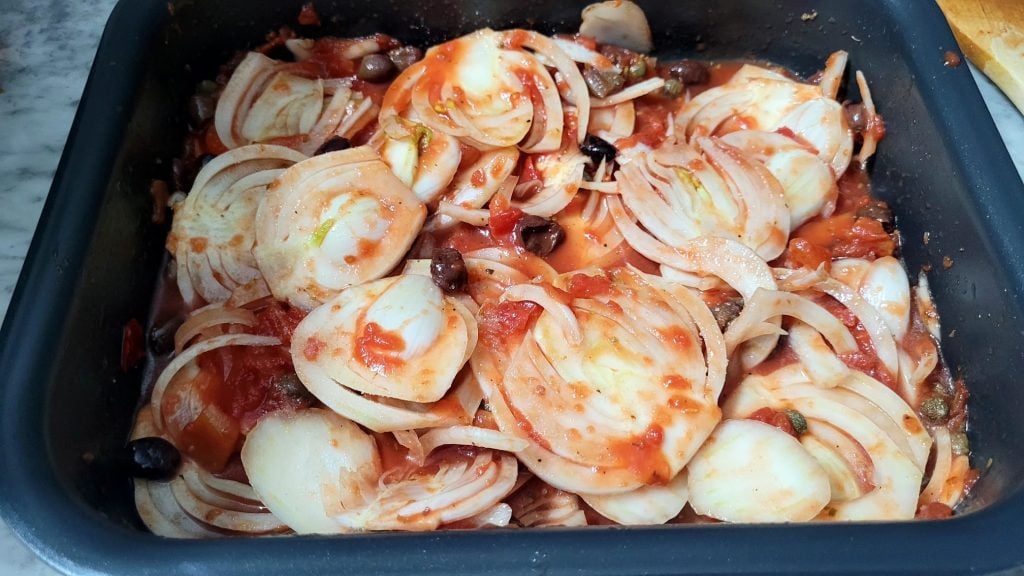 • Depois de cortá-los, transfira-os para uma assadeira e adicione todos os ingredientes, as alcaparras dessalgadas e espremidas, as anchovas picadas, as azeitonas, o molho de tomate, sal, pimenta e orégano exceto o parmesão, que será usado para gratinar