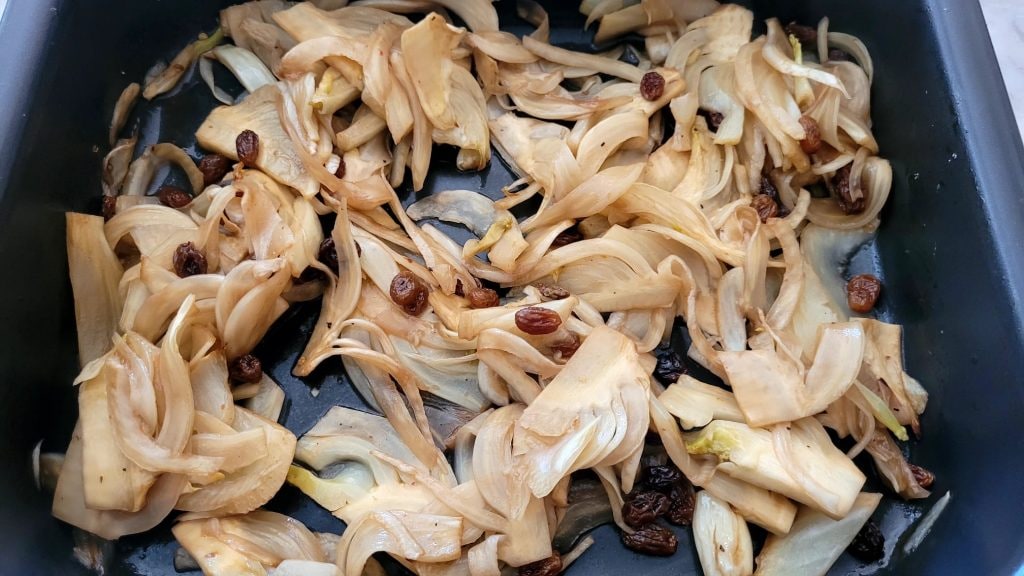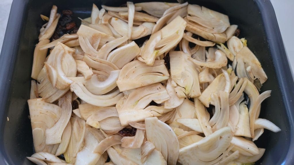 Limpe e corte os funchos em fatias finas (reserve um pouco da barba para decorar), coloque-os em uma assadeira e tempere com a emulsão de azeite, vinagre branco, glacê, sal, pimenta, a pimenta vermelha picada e as passas previamente reidratadas e escorridas. Misture bem e adicione uma xícara de água, não mais, os funchos já contêm água.