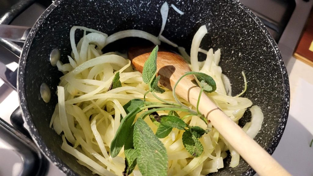 Enquanto espera que os ovos esfriem, descasque e fatie a cebola e deixe-a murchar em uma frigideira pequena com um fio de azeite e a sálvia, tempere com sal