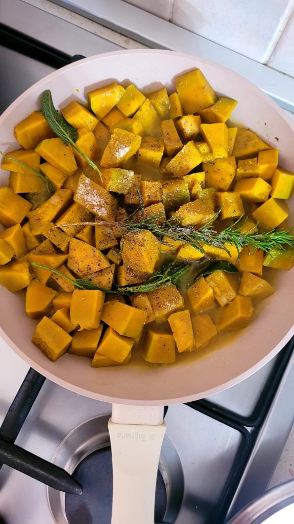 Adicione a abóbora, a sálvia e o alecrim e deixe a abóbora amolecer, cobrindo com uma tampa. Mexa de vez em quando para não deixar a abóbora grudar no fundo da frigideira. Se necessário, adicione meio copo de água. Isso levará cerca de 10/15 minutos. Tempere com sal, pimenta e noz-moscada