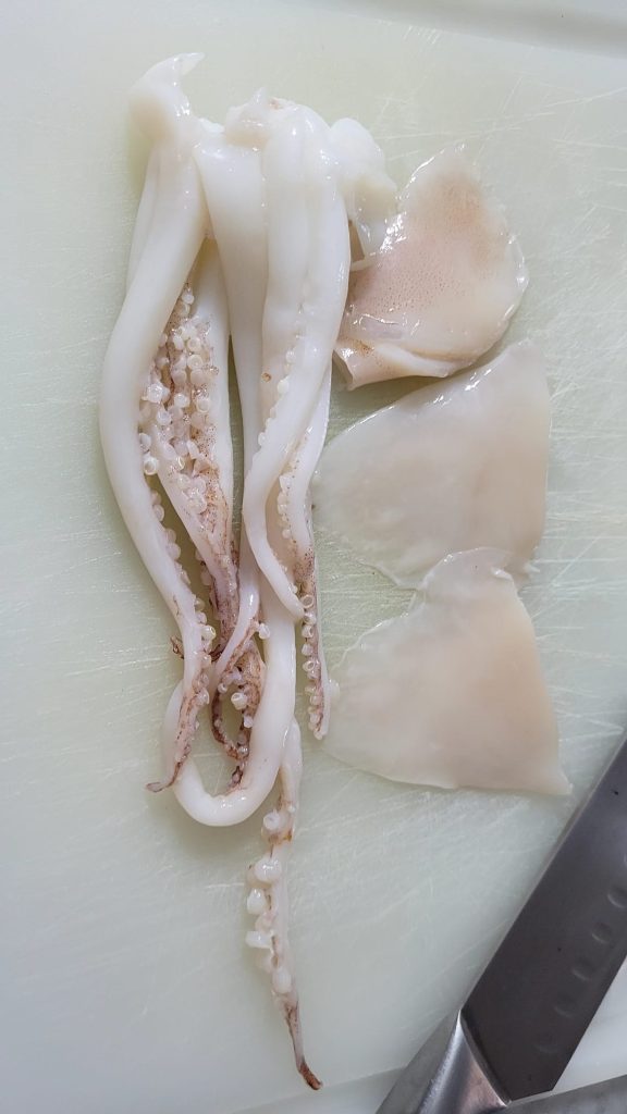 Pique finamente todas as barbatanas e 3 tentáculos, mantenha 2 inteiros